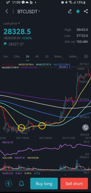 - 5일 이평선은 단기 추세파악에 있어서 중요한 역할을 한다. 단타에 주로 쓰이는 이평선으로 암호화폐 시장에선 3일 이평선이 더 정확하다는 말도 있다 그래도 필자는 사람들이 많이 쓰는 5일 이평선을 주로 사용하고 있다.