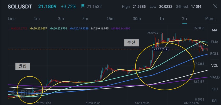 장기, 중기, 단기 이평선이 서로 떨어져 있는 거리와 밀집도 그리고 집중되거나 분산되면서 상승과 하락을 순환하는 과정을 통해서 분석하는 방법입니다.