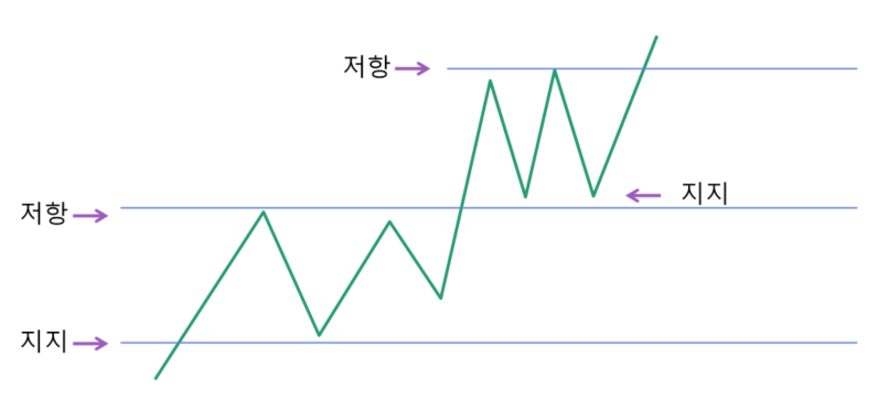 가격의 움직이는 방향이 어디까지 내려가거나 올라가는 것을 지지선과 저항선을 통해서 알아낼수있습니다. 저항선을 돌파하는것을 실패하면 하락으로 전환될 가능성이 크며 지지선을 두번, 세번 발돋움 한다면 가격은 상승세로 갈 가능성이 높습니다. 이러한 시그널을 놓치지 않고 매수와 매도 하는 연습을 해봅시다.