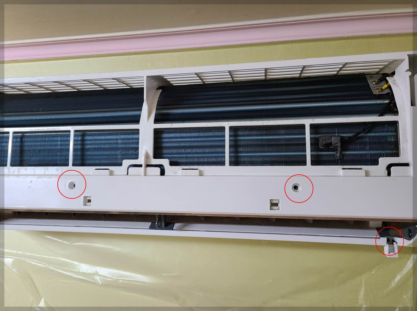 ▼ 에어컨 뚜껑을 열면 나사 두개가 딱 버티고 있습니다. 나사를 풀어주세요 보통 에어컨 4개 나사가 있는데 간혹가다가 숨어있는 경우도 있습니다. 빨간색 동그라미가 나사가 있는 구간이고 사진에는 안나왔지만 반대편에도 나와있습니다.