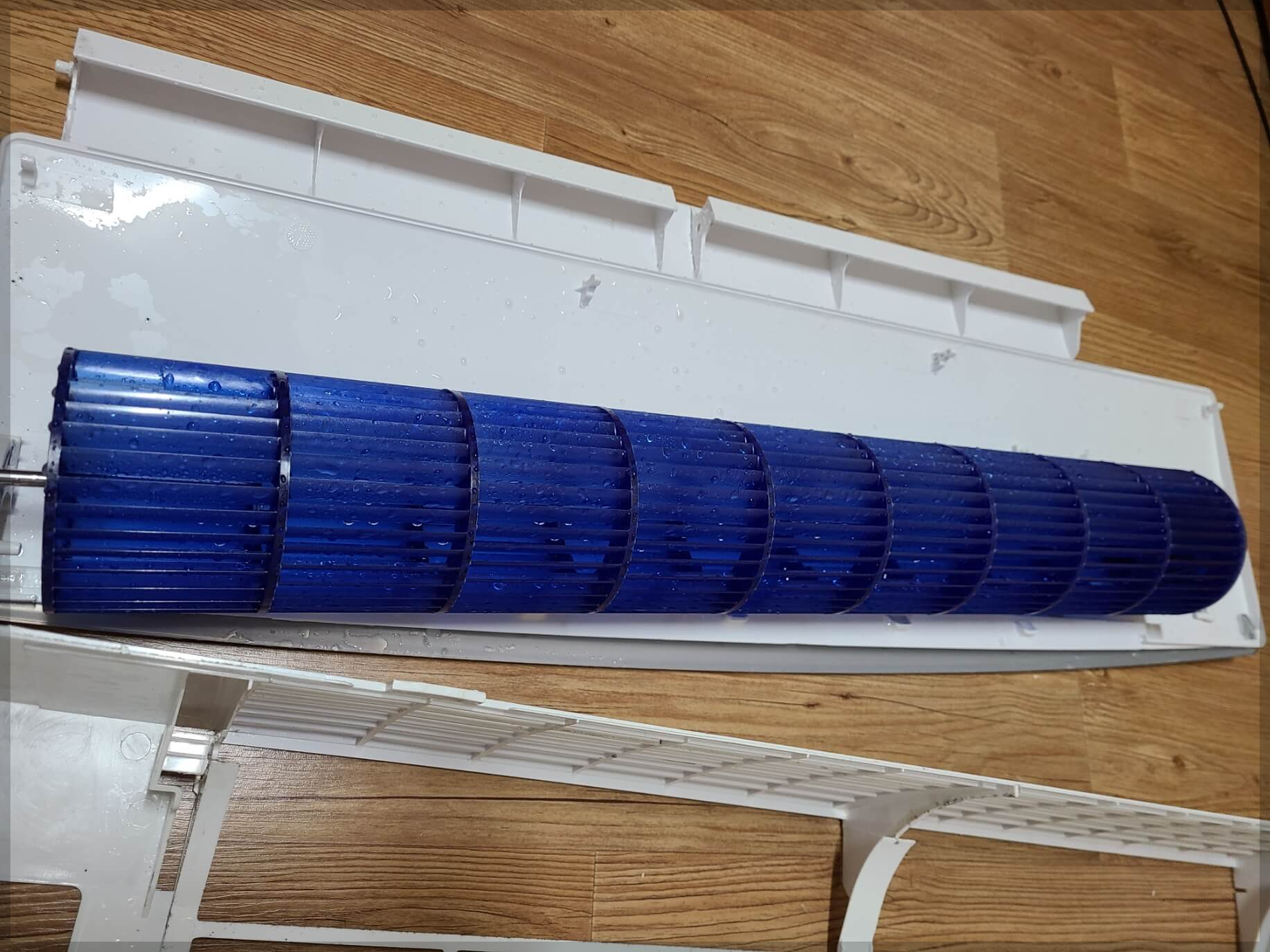 ▼이렇게 다시 부착했습니다. 부착하니 파란색이 영롱하니 이뻤습니다. 완전 말려서 조립하라고 들었지만 성미가 급한 저는 씻고 바로 부착했습니다. 부착하고 에어컨을 송풍으로 돌려서 말리려고 생각했습니다.