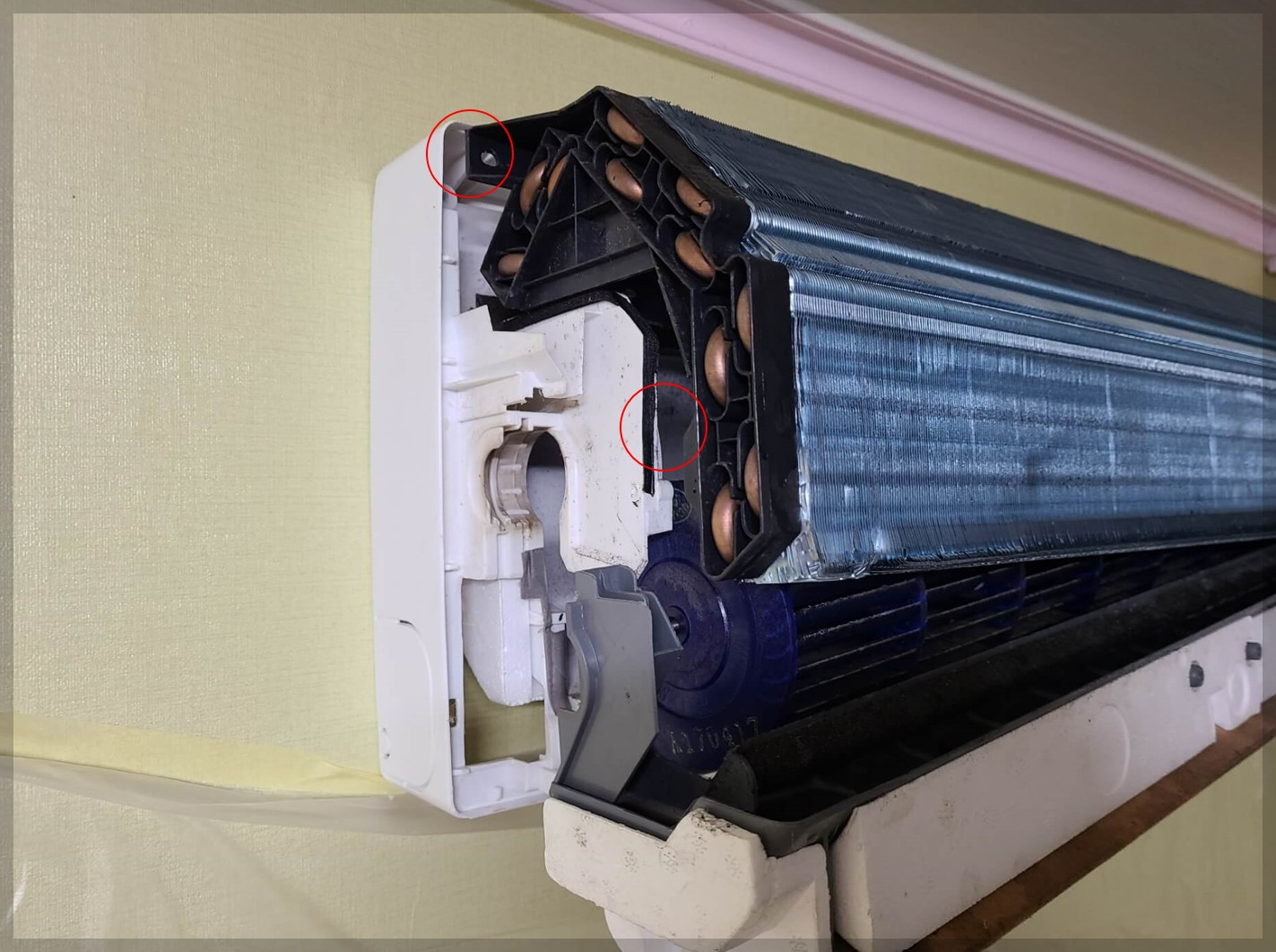 ▼ 에어컨 뚜껑을 열면 나사 두개가 딱 버티고 있습니다. 나사를 풀어주세요 보통 에어컨 4개 나사가 있는데 간혹가다가 숨어있는 경우도 있습니다. 빨간색 동그라미가 나사가 있는 구간이고 사진에는 안나왔지만 반대편에도 나와있습니다.