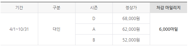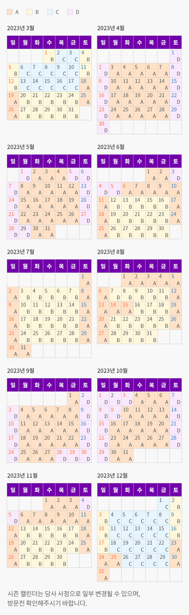 ☞ 요금이 A, B, C, D가 붙어서 헷갈릴 수 있는데 아래 달력을 보시면 써있는 날이 해당 요금이 적용되는 날입니다.