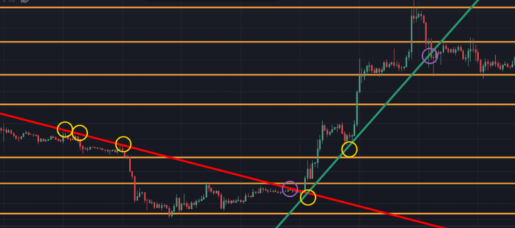 위 차트 처럼 노란 동그라미에서는 저항 또는 지지를 받았으며 보라색에서는 추세선을 돌파하면서 추세변화가