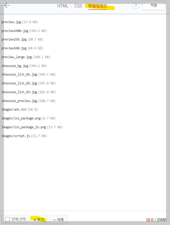 ▼ 상단에 파일업로드를 클릭, 하단에 +추가버튼을 클릭합니다. 그러면 파일을 추가 하는 화면이 나오는데 아까만들어뒀던 ads.txt파일을 추가해주시면 되겠습니다 마지막으로 우측상단에 적용 버튼을 눌러주면 설정은 해결됩니다.