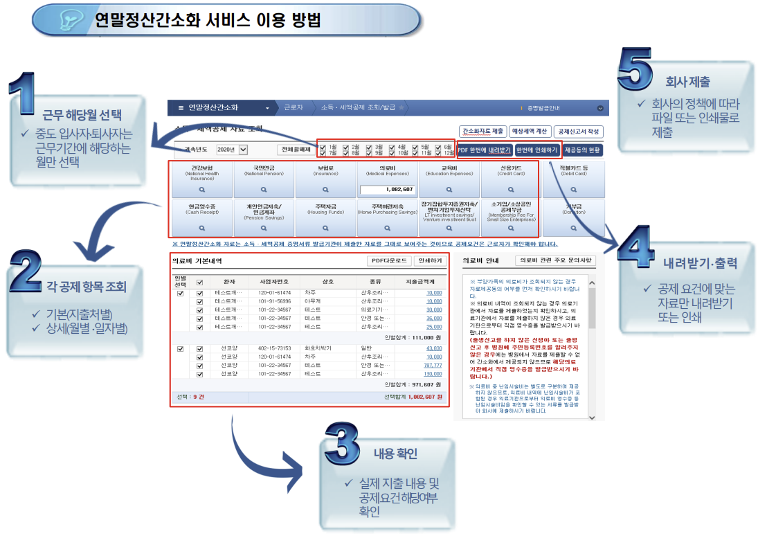 근로자는 연말정산 간소화 서비스를 활용해서 소득, 세액공제 증명서류를 출력하거나 PDF로 내려 받아 소득, 세액 공제신고서를 회사에 제출하게 됩니다.